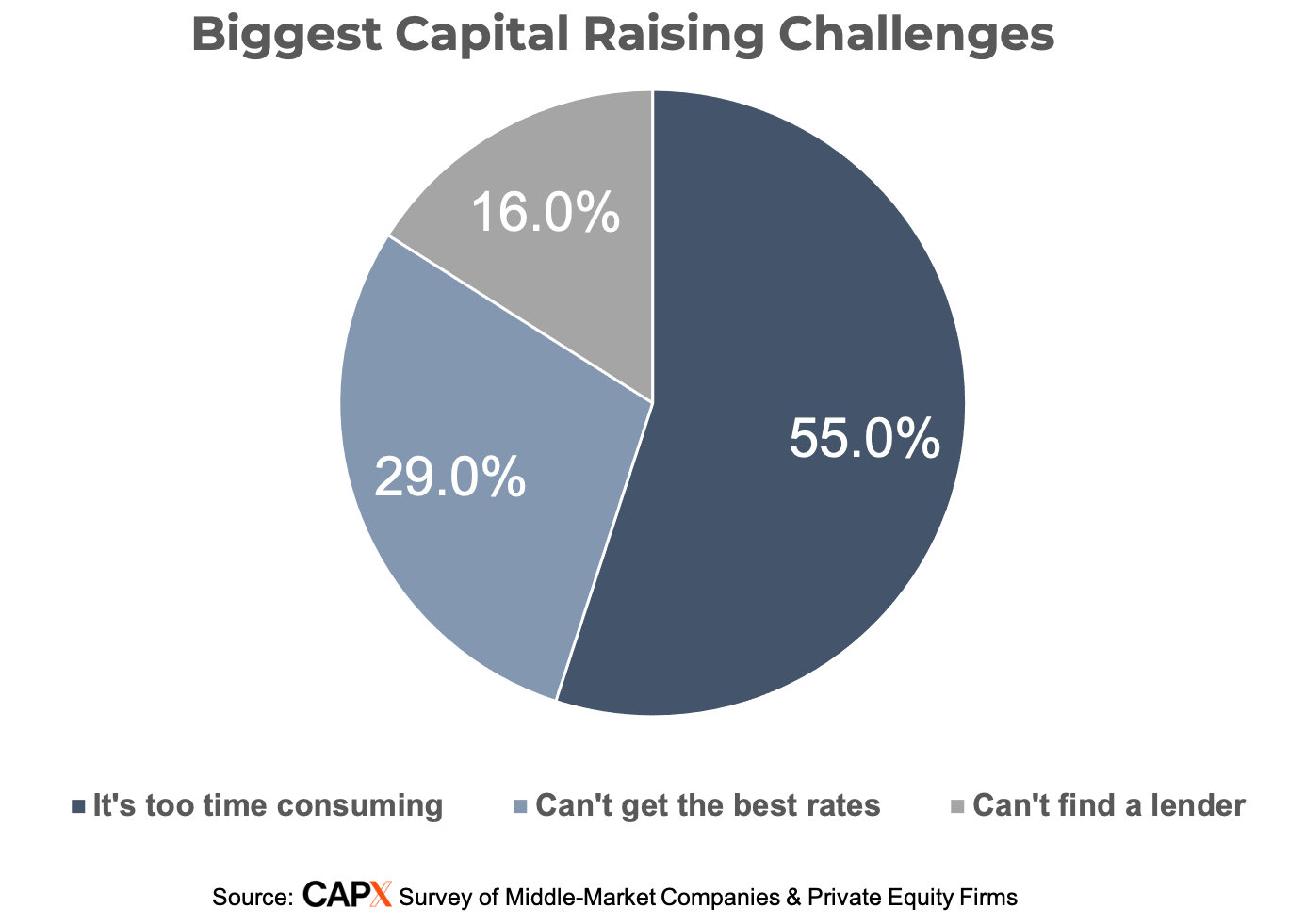 We validated this reality in a recent survey we conducted with middle market corporations and PE firms. We asked participants to identify key pain points in the process of finding capital. 55% of survey respondents pointed out that the process of securing capital is too time consuming.